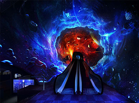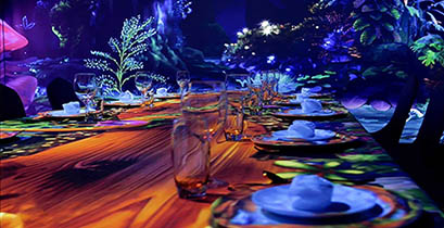 沉浸式餐廳是通過多個投影設備對各種長度形狀的幕墻進行投影照射,將素材視頻,通過晟跡大屏融合技術,準確的展現在各種幕墻,地板,餐桌,甚至天花,從而營造出全方位,多層次且相互銜接的影像。