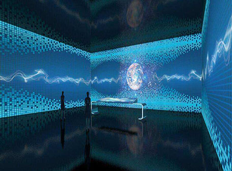 投影幕為采用多塊投影幕拼接而成的多通道折幕,它比普通的標準投影系統具備更大的顯示尺寸、更寬的視野、更多的顯示內容以及更具沖擊力和沉浸感的視覺效果。