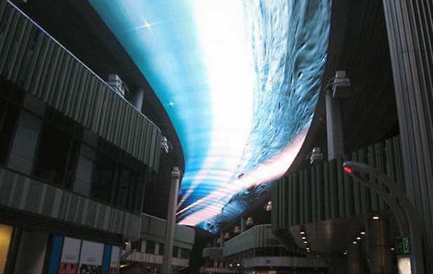投影天幕系統一般使用多臺投影儀投影畫面,然后通過晟跡的投影融合技術無縫拼接畫面,伴隨立體聲環繞聲,讓人感覺自己就在現場,具有身臨其境的感覺。當然,全息天幕投影也可以用發光二極管屏幕代替投影屏幕作為播放載體,但對安裝環境的要求相對較高。